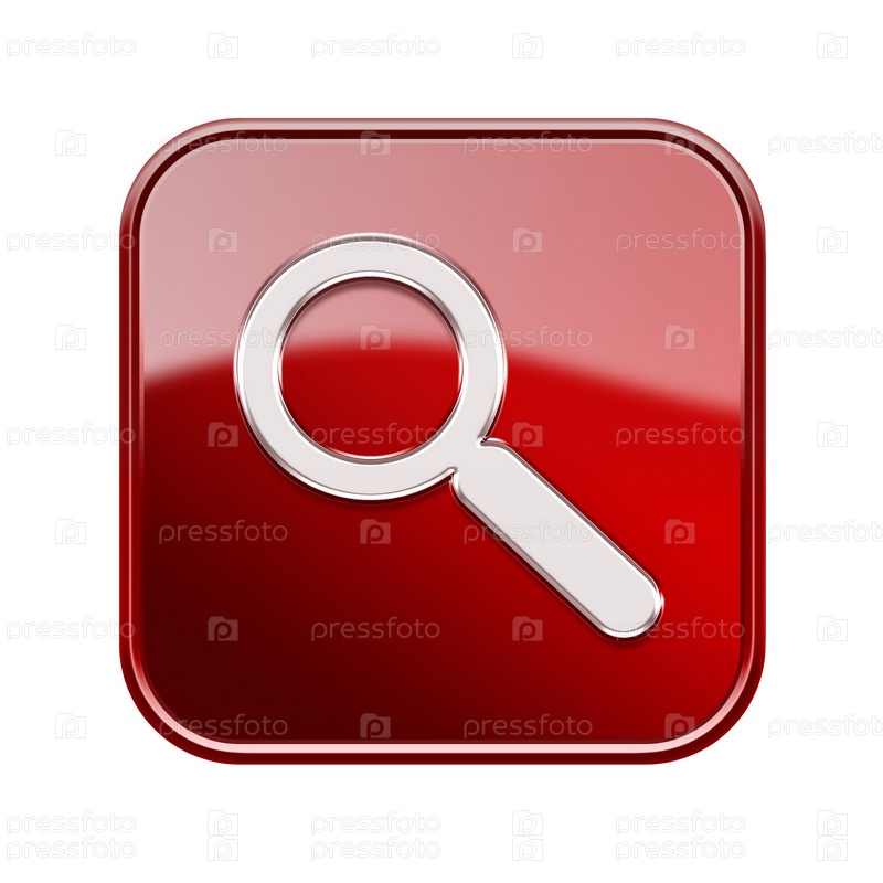 Глянцевый красный значок лупы, изолированный на белом фоне