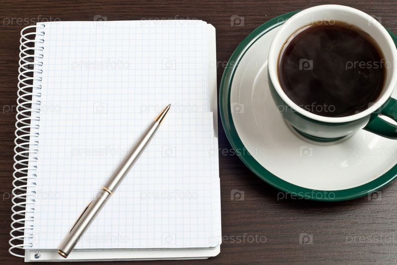 Записная книжка, ручка и чашка кофе