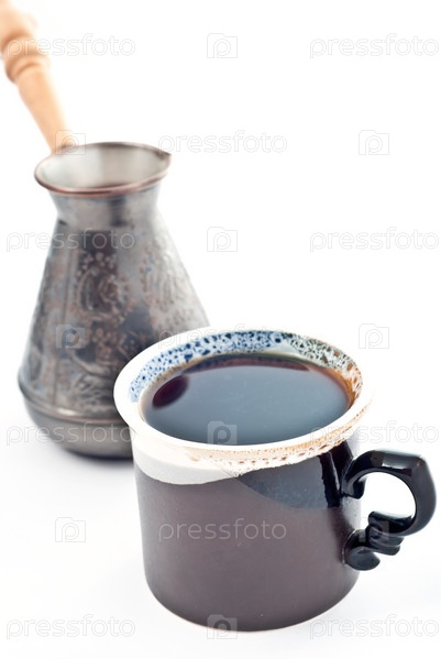 Чашка кофе и турка на белом фоне