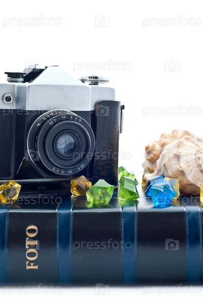 Старый фотоаппарат, фотоальбом и морские ракушки на белом фоне