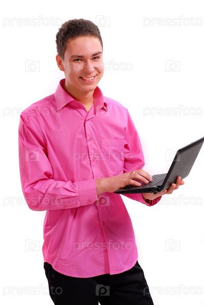 Молодой человек в розовой рубашке с ноутбуком