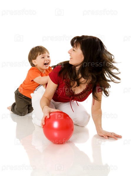 Мать играет в мяч с маленьким сыном на белом фоне