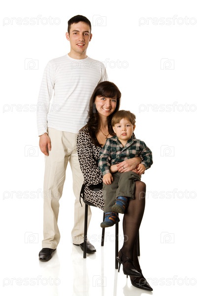 Отец, мать и маленький сын на белом фоне