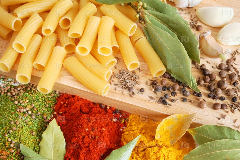 Макароны со свежими лавровыми листьями, чесноком, черным перцем, петрушкой, ореганом, красными паприками, куркумой и семенами ромашки на деревянной доске