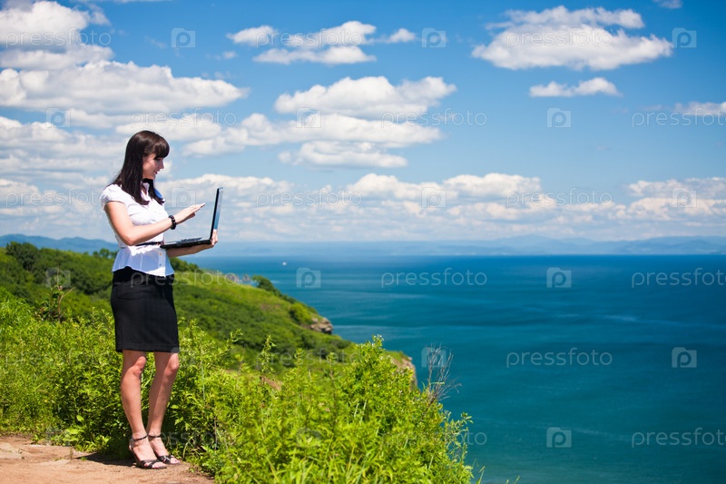 Красивая девушка в деловом костюме с ноутбуком стоит на фоне моря