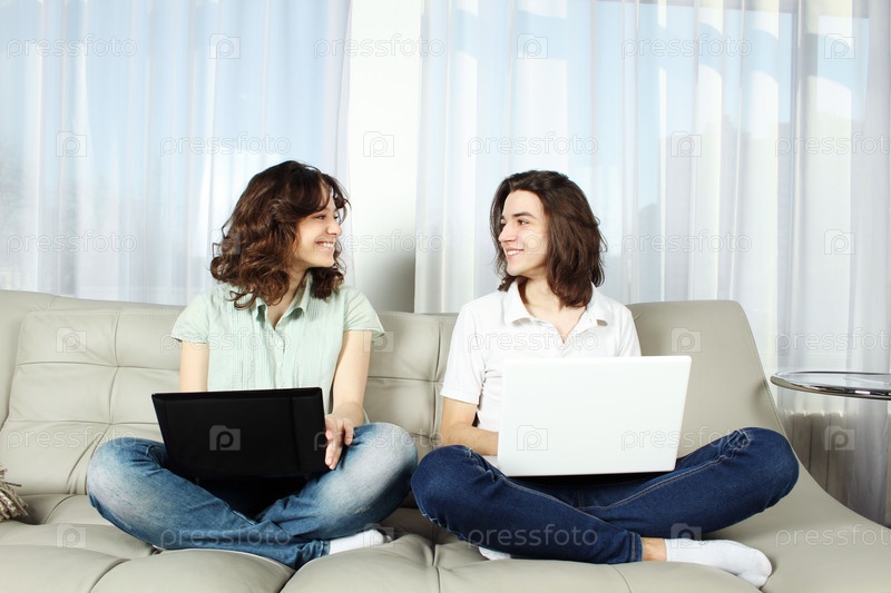 Молодая пара сидит на диване с ноутбуками, скрестив ноги