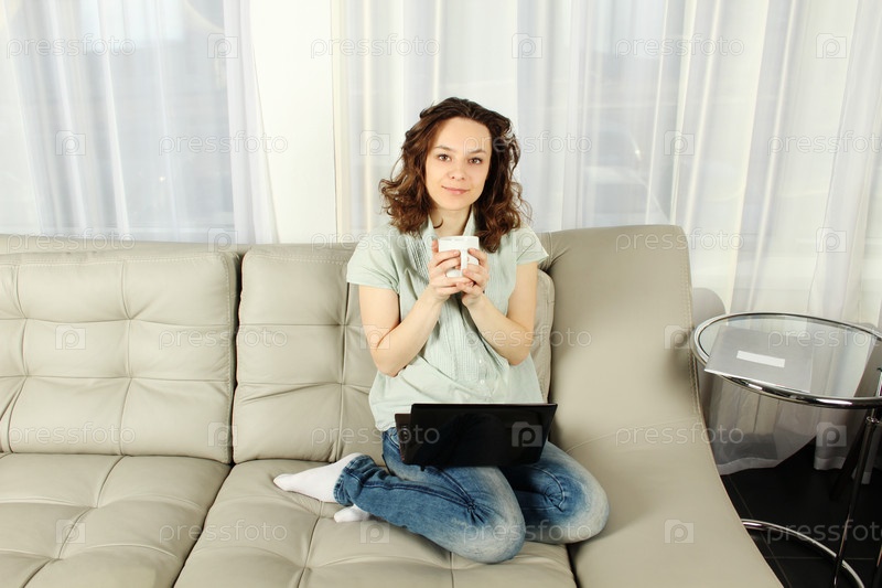 Молодая привлекательная женщина сидит на диване с чашкой кофе и ноутбуком