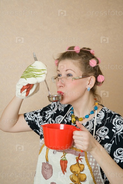 Домохозяйка с красным ковшиком и половником