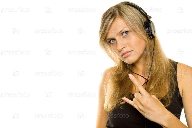 Девушка в наушниках слушает музыку на белом фоне