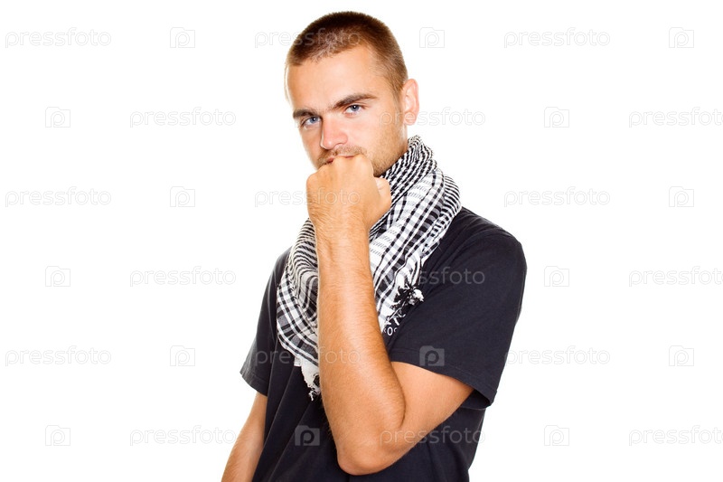 Портрет молодого человека, одетого в черную футболку и палестинский платок на шее