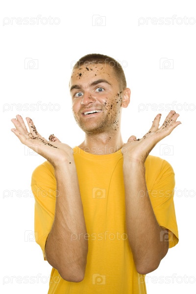 Молодой человек в желтой футболке с испачканными в земле лицом и руками