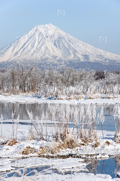 Красивый зимний пейзаж с видом на вулкан и реку