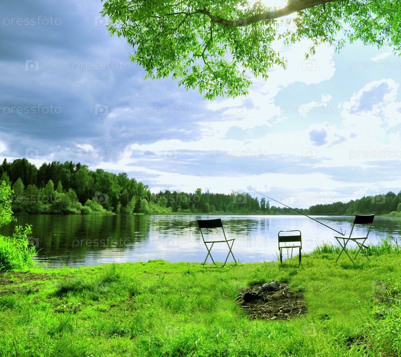 Речное рыболовное место под голубым небом никто на стульях