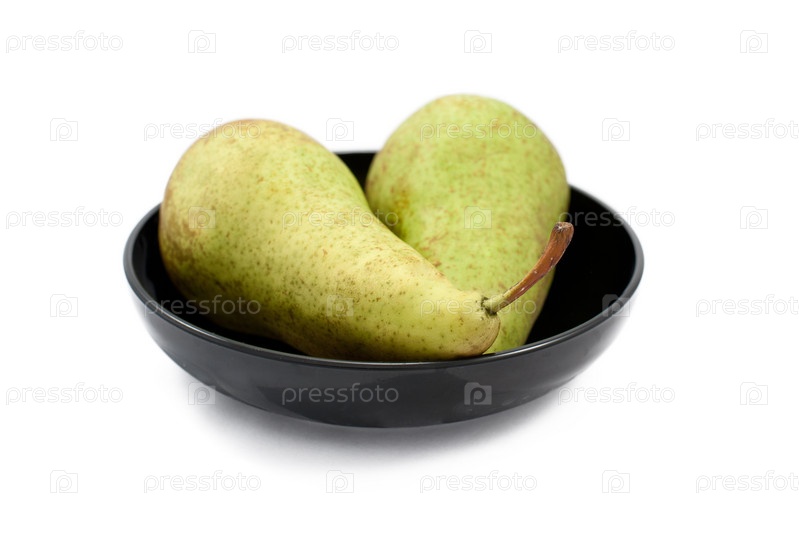 Две груши на тарелке на белом фоне