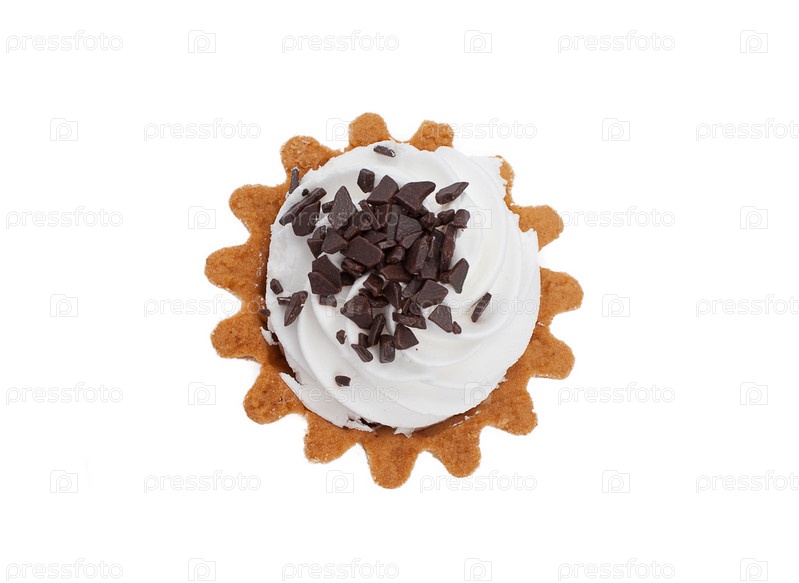 Пирожное с кремом, украшенное шоколадной крошкой, на белом фоне