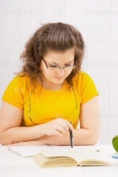 Молодая женщина в очках читает книгу