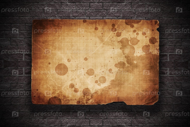 Старый лист бумаги, покрытый пятнами, на фоне кирпича