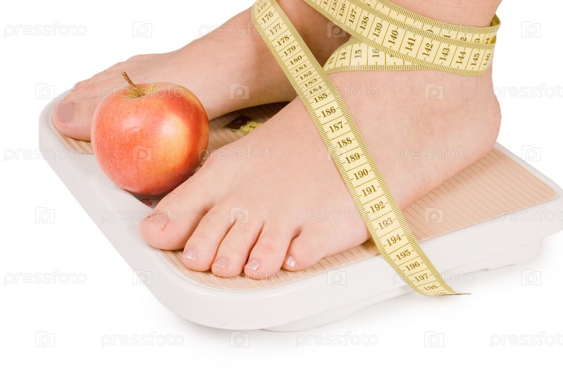 Женские ноги на весах с яблоком и сантиметровая лента