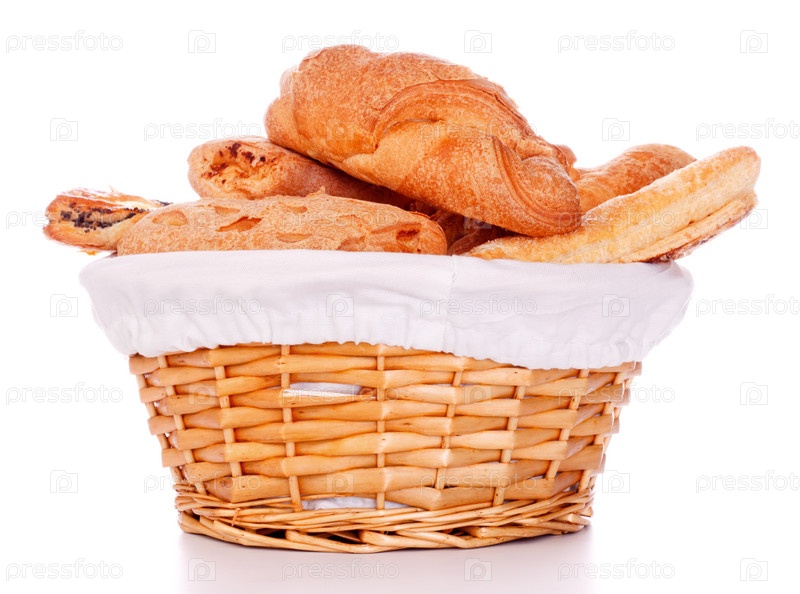 Корзинка с выпечкой на белом фоне