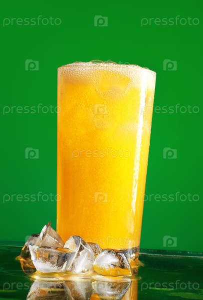 Стакан апельсинового сока и кубики льда на зеленом фоне