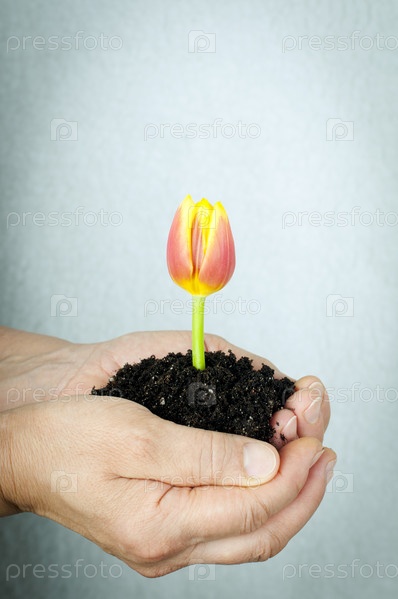 Руки пожилой женщины, держащие растущий тюльпан