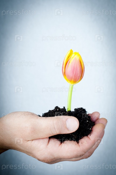 Женская рука, держащая растущий тюльпан