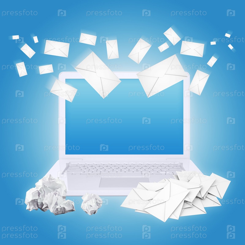 Ноутбук, смятая бумага и конверты