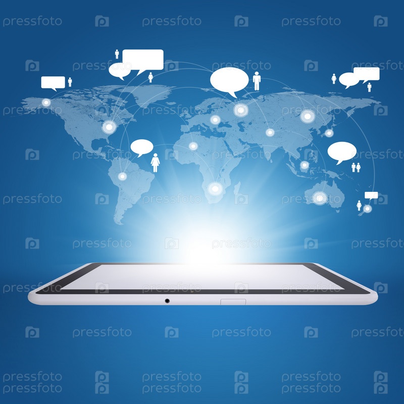 Планшетный компьютер и карта мира с контактами