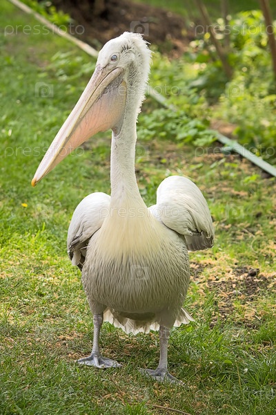 Пеликан крупным планом на фоне травы в зоопарке, Россия