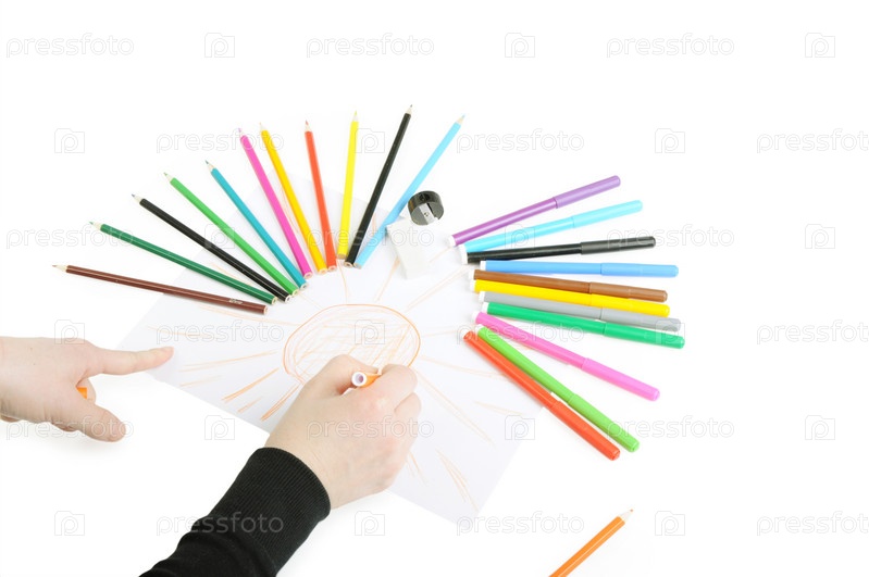 Цветные карандаши, фломастеры и детские руки, рисующие солнце