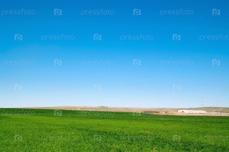 Зеленое поле и фермерские постройки вдалеке
