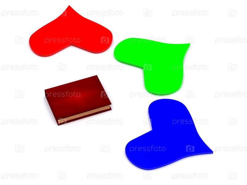 Нарисованные разноцветные сердца вокруг книги на белом фоне
