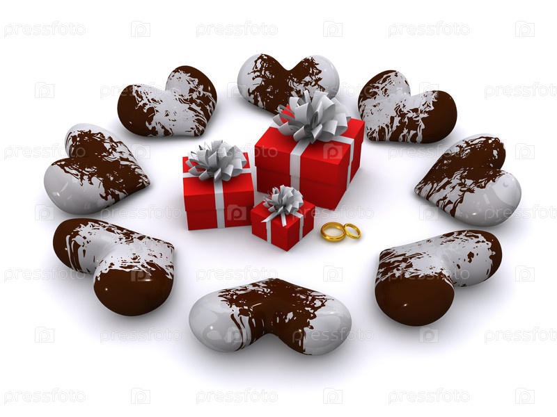 Нарисованные шоколадные сердца вокруг подарков на белом фоне