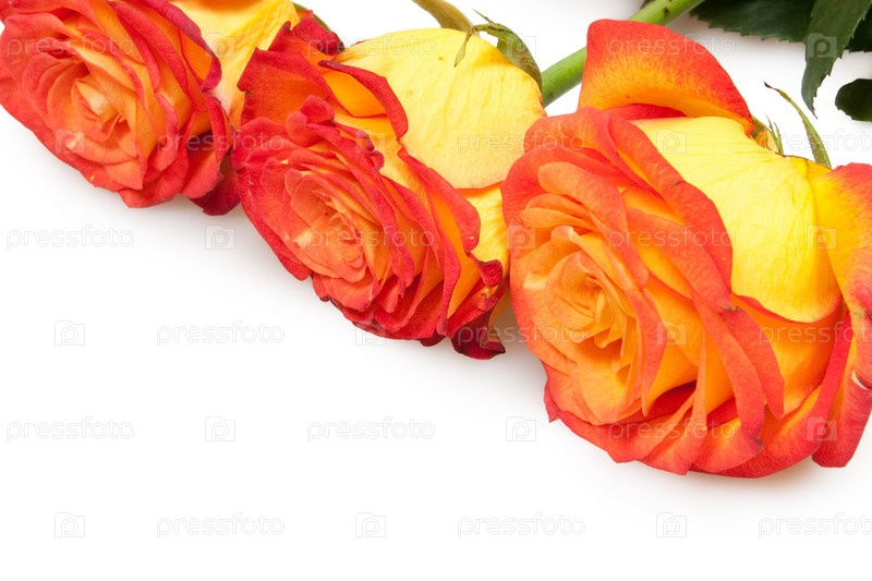 Три желто-красные розы на белом фоне