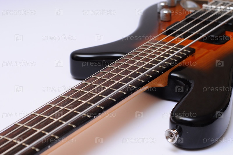 Бас-гитара крупным планом на белом фоне