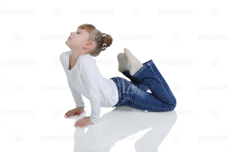 Девочка занимается гимнастикой на полу на белом фоне