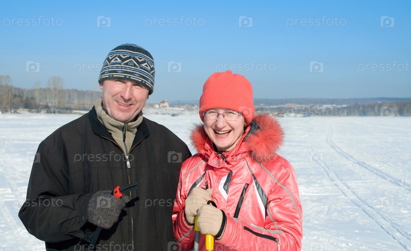 Счастливая пара взрослых людей на лыжной прогулке