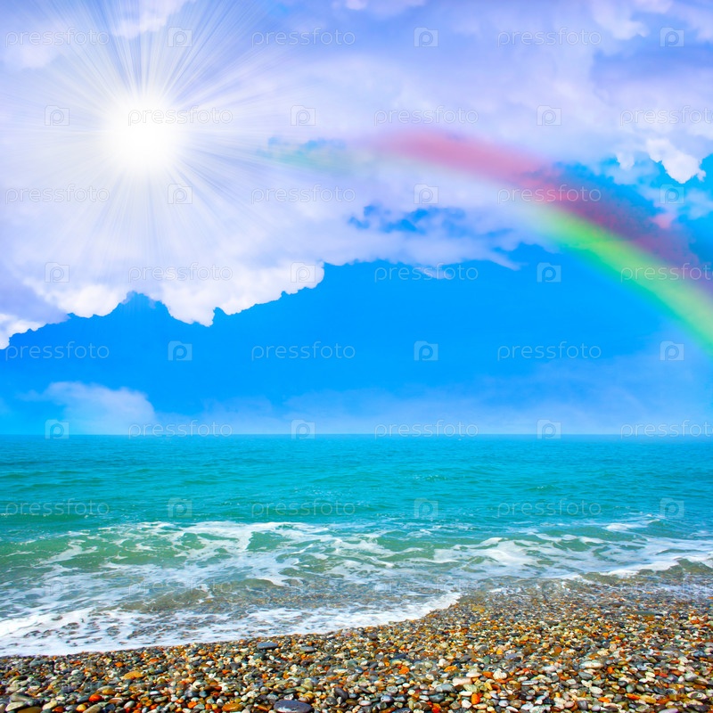Солнце и радуга в облачном небе над морским пляжем