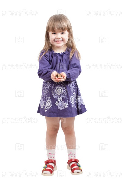 Маленькая девочка с монетами в руках на белом фоне