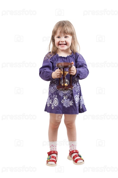 Маленькая девочка с песочными часами в руках на белом фоне