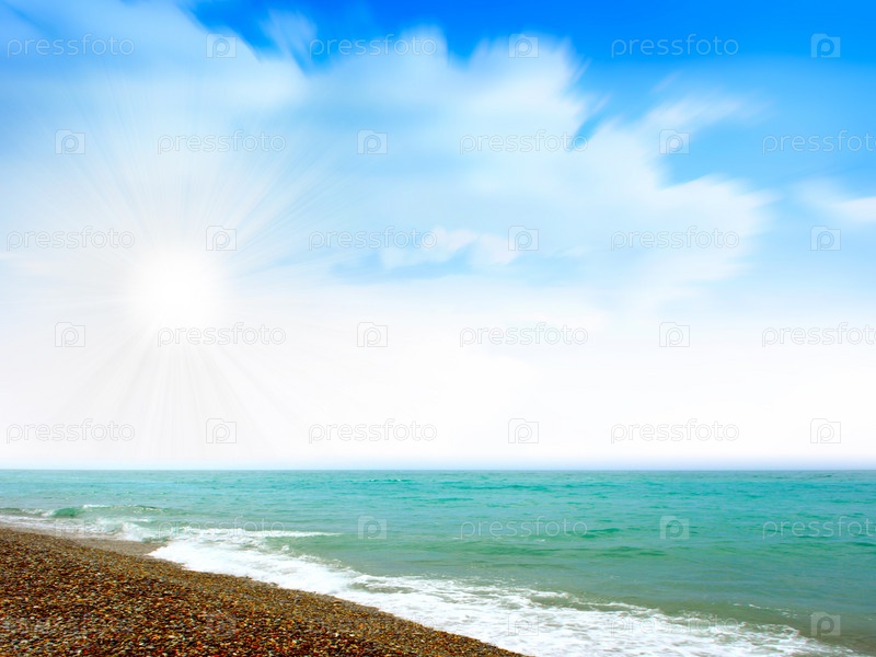Морской берег на фоне голубого облачного неба