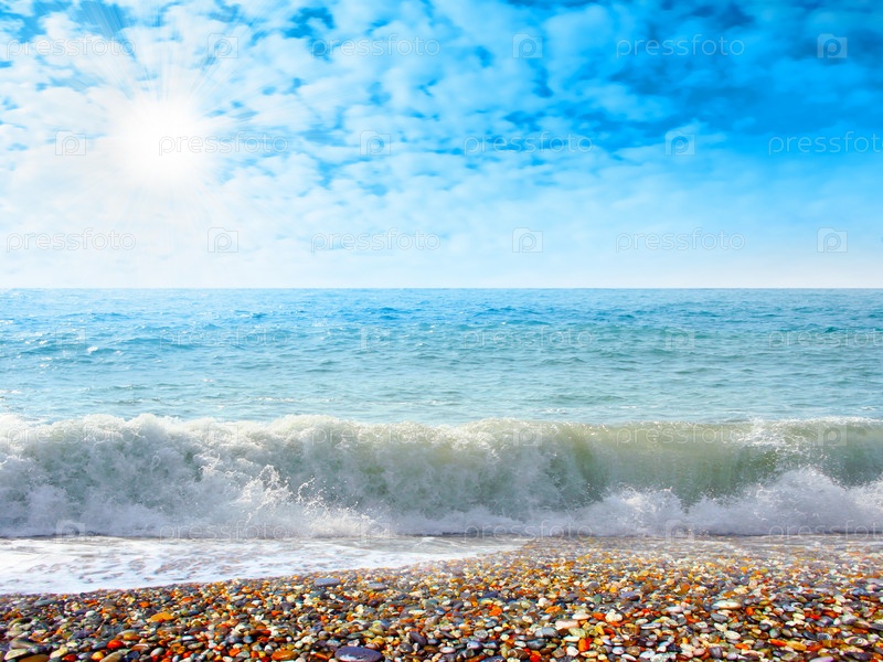 Морской берег на фоне голубого неба
