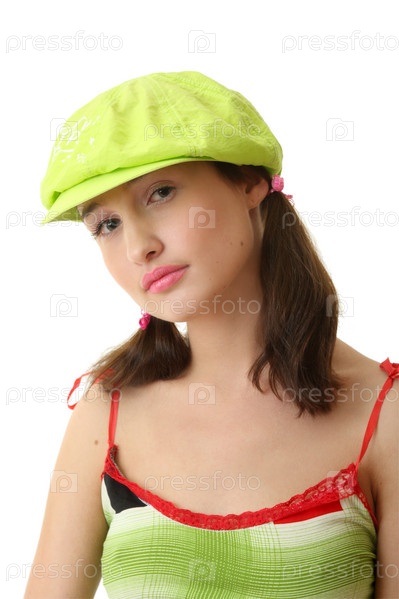 Девушка в зеленой шляпе с лиловым букетом
