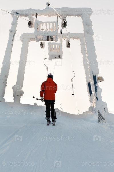 Горнолыжник в красной куртке на бугельном подъемнике