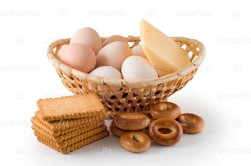Куриные яйца, сыр, печенье и сушки