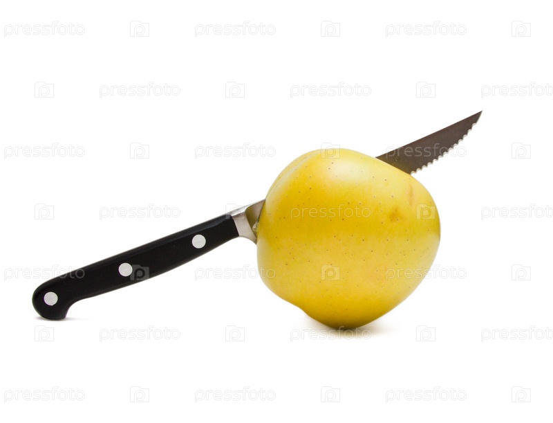 Кухонный нож и яблоко на белом фоне
