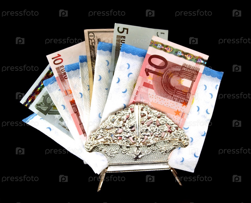 Бумажный салфетка с деньгами в поддержку против черного фона