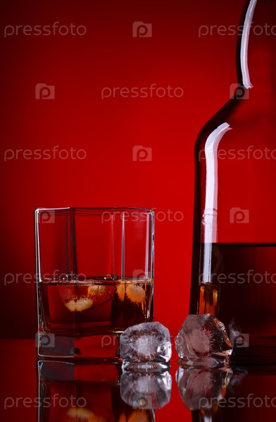 Бутылка и стакан виски со льдом крупным планом