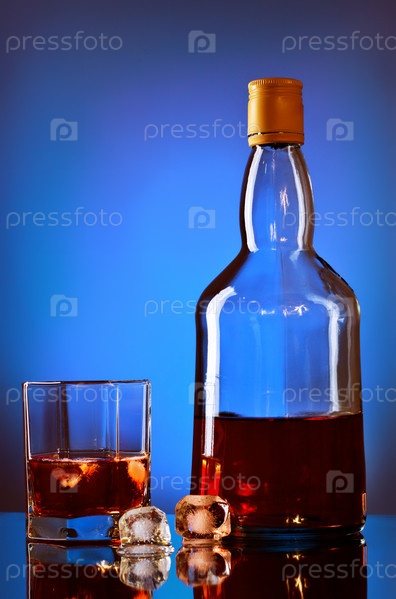 Бутылка и стакан виски со льдом на голубом фоне