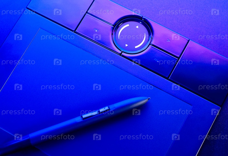 Таблетка для рисования с ручкой в ближайшем изображении синего света